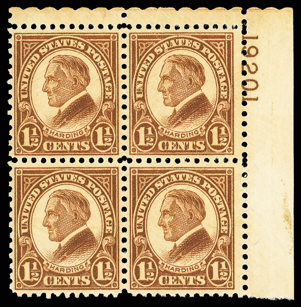 7171 nh/ogbl 633 image1927, 1½¢ Harding, rotary press printing (Scott 633), top right plate number 19201 block of 4, Bright, crystal-clear coloring, o.g., top stamps lightly hinged (2 stamps never hinged), Fine to Very Fine.