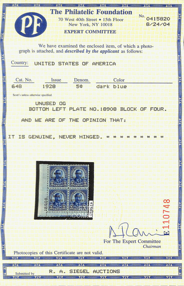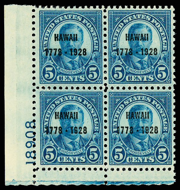 7173 nhbl 648 image1928, 5¢ Hawaii (Scott 648), bottom left plate block of 4 with plate number 18908, Strong, well-held color with real depth, o.g., never hinged, Very Fine, with 2004 P.F. certificate.