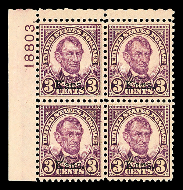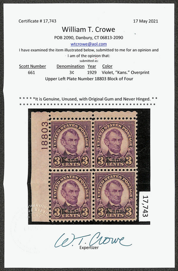 7177 nhbl 661 image1929, 3¢ Kans. (Scott 661), top left plate block of 4 with plate number 18803, Fresh, glowing color, o.g., never hinged, Fine to Very Fine, with 2021 Crowe certificate.
