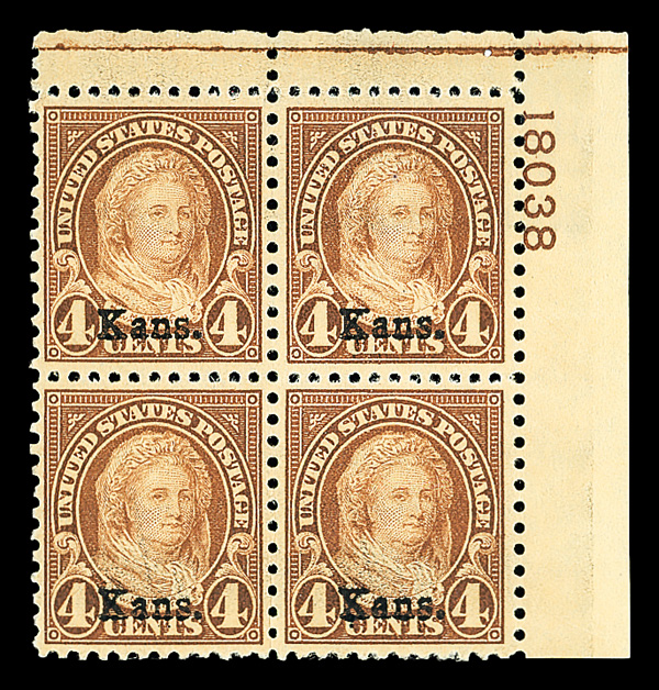 7178 nhbl 662 image1929, 4¢ Kans. (Scott 662), top right plate block of 4 with plate number 18038, Fresh, crisp impression, right stamps are very well centered, o.g., never hinged, Very Fine.