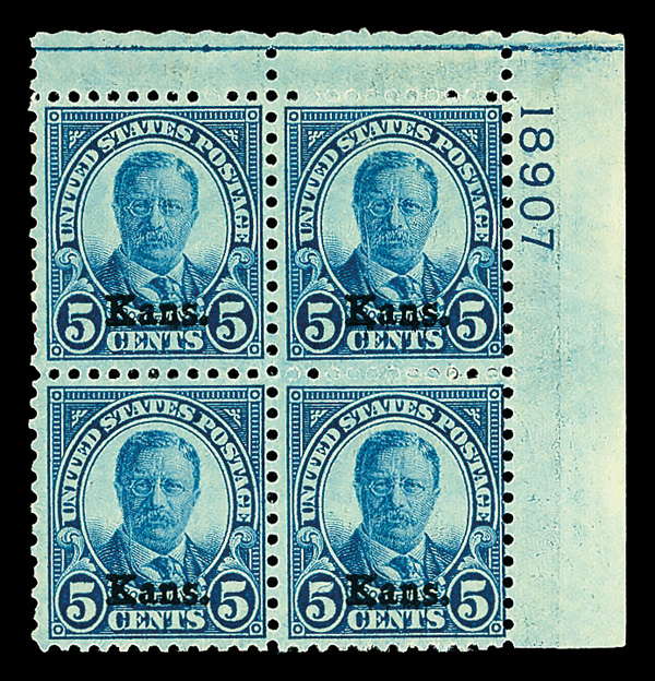 7180 ogbl 663 image1929, 5¢ Kans. (Scott 663), top right plate block of 4 with plate number 18907, Still wonderfully fresh, o.g., previously hinged, Fine to Very Fine.