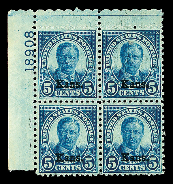 7179 nhbl 663 image1929, 5¢ Kans. (Scott 663), top left plate block of 4 with plate number 18908, Fresh and beautifully bright, o.g., never hinged, Fine to Very Fine.