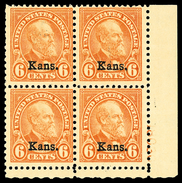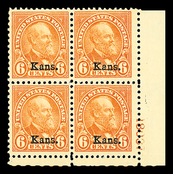 7181 nhbl 664 image1929, 6¢ Kans. (Scott 664), bottom right plate block of 4 with plate number 18037, Fresh and glowing, o.g., never hinged; small corner crease in lower left selvage, Very Fine.