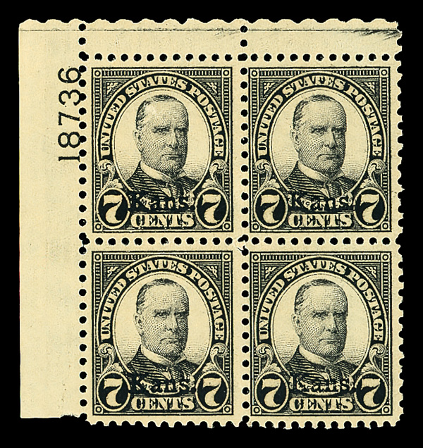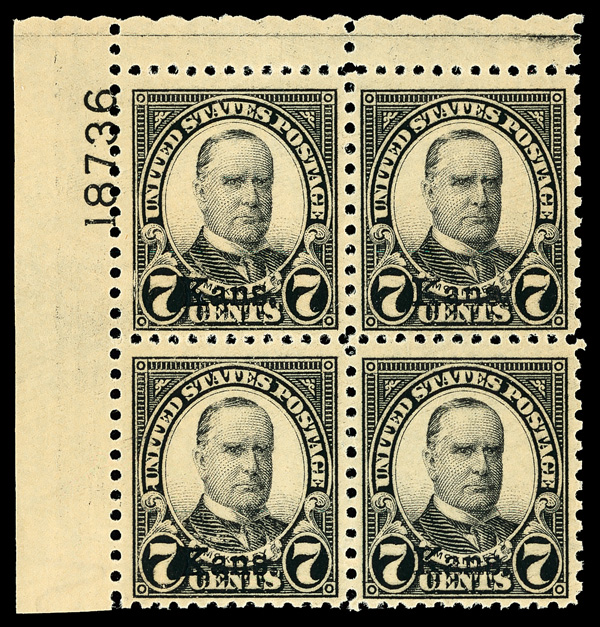 7183 nh/ogbl 665 image1929, 7¢ Kans. (Scott 665), top left plate block of 4 with plate number 18736, Fresh and nicely bright, o.g., top stamps lightly hinged (2 stamps never hinged), Fine to Very Fine.
