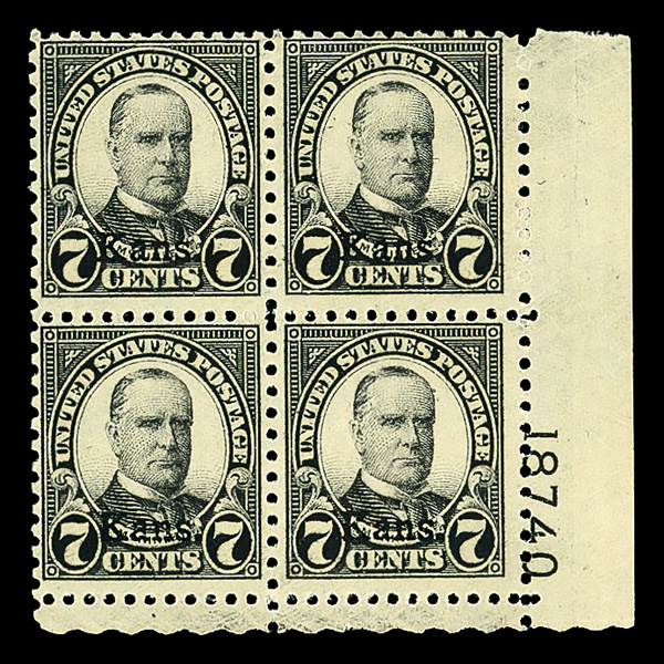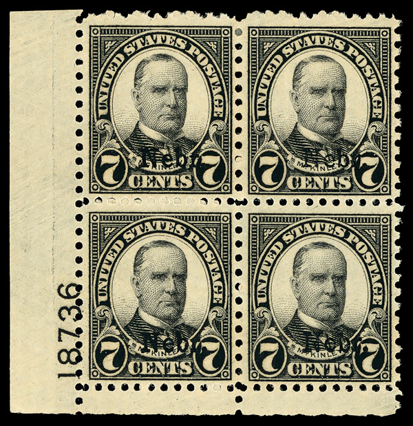 7194 nh/ogbl 676 image1929, 7¢ Nebr. (Scott 676), bottom left plate block of 4 with plate number 18736, Bright, well-preserved ink tones, o.g., top stamps with small hinge remnant (2 stamps never hinged), Fine to Very Fine.