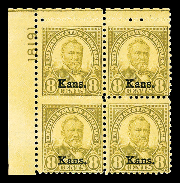 7184 nhbl 666 image1929, 8¢ Kans. (Scott 666), top left plate block of 4 with plate number 18191, Fresh, brilliant tone, o.g., never hinged, Very Good to Fine.
