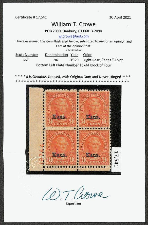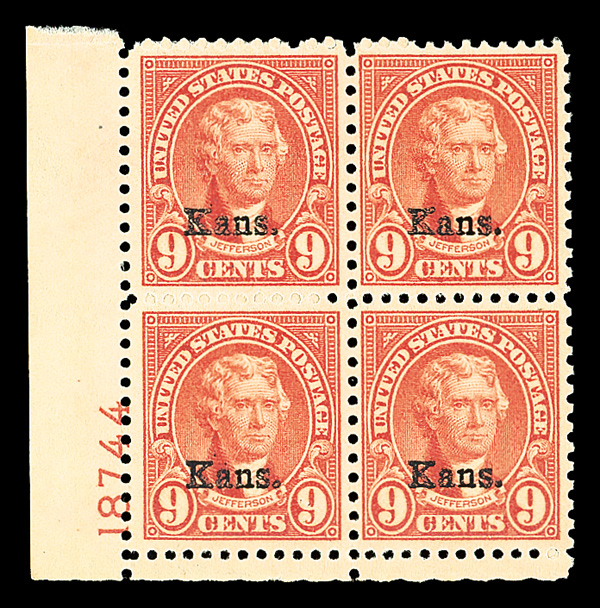 7185 nhbl 667 image1929, 9¢ Kans. (Scott 667), bottom left plate block of 4 with plate number 18744, Remarkably fresh hue, left stamps very well centered, o.g., never hinged, Fine to Very Fine, with 2021 Crowe certificate.