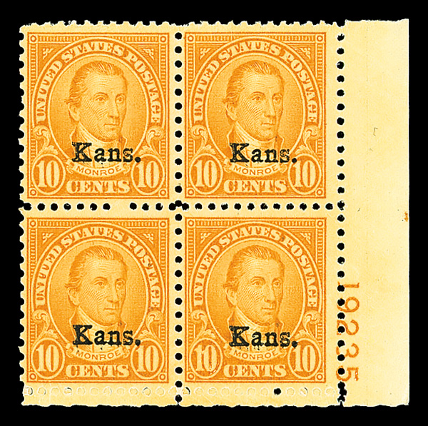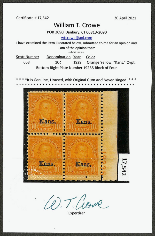 7186 nhbl 668 image1929, 10¢ Kans. (Scott 668), bottom right plate block of 4 with plate number 19235, Fresh, full-bodied hue, o.g., never hinged, Fine to Very Fine, with 2021 Crowe certificate.