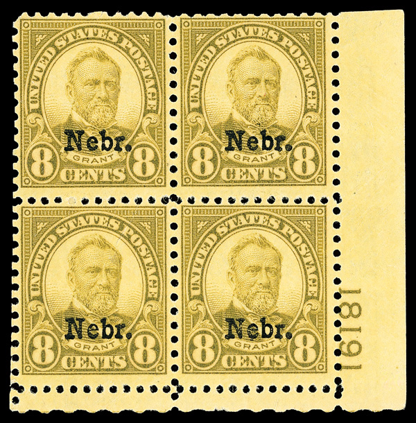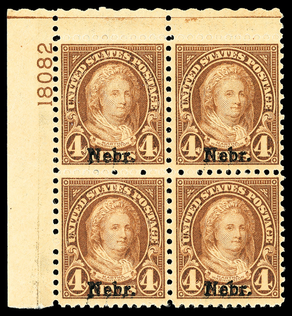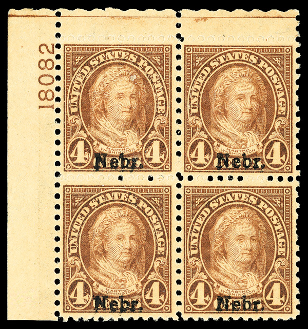 7189 nhbl 673 image1929, 4¢ Nebr. (Scott 673), top left plate block of 4 with plate number 18082, Fresh and wonderfully vibrant, o.g., never hinged, Fine.