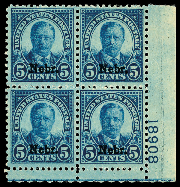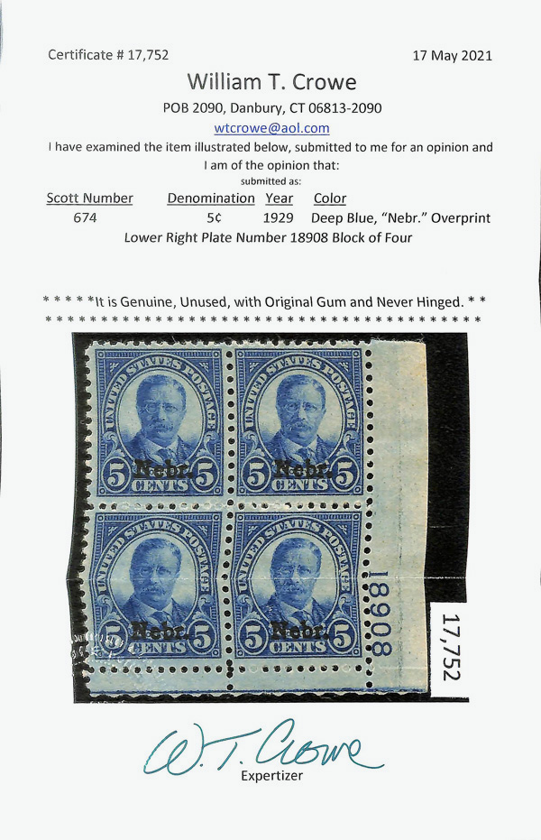 7191 nhbl 674 image1929, 5¢ Nebr. (Scott 674), bottom right plate block of 4 with plate number 18908, Fresh and rich throughout, o.g., never hinged; light gum skips, Fine to Very Fine, with 2021 Crowe certificate.