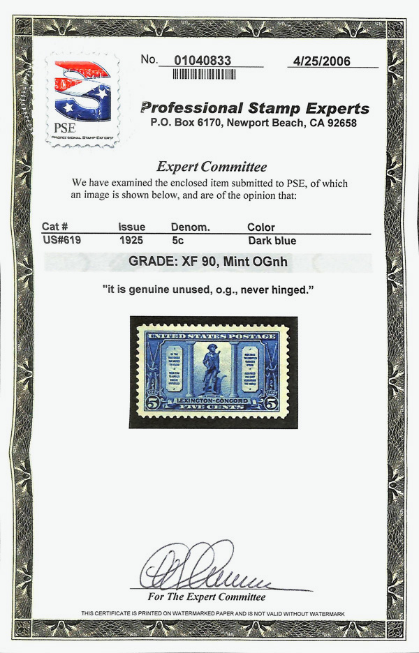 7161 nh 619 image1925, 5¢ Lexington-Concord (Scott 619), o.g., never hinged, Extremely Fine, with 2006 P.S.E. certificate graded XF 90.