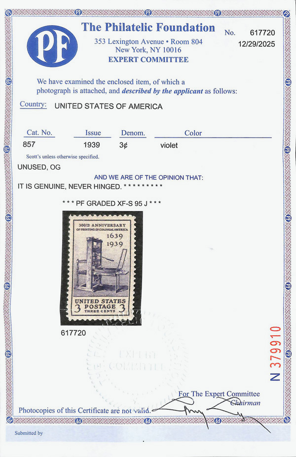 7241 nh 857 image1939, 3¢ Printing Tercentenary (Scott 857), o.g., never hinged, jumbo margins, Extremely Fine to Superb no SMQ price, with 2025 P.F. certificate graded XF-SUP 95J. (Image) (Image2) (All Images)