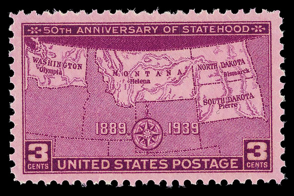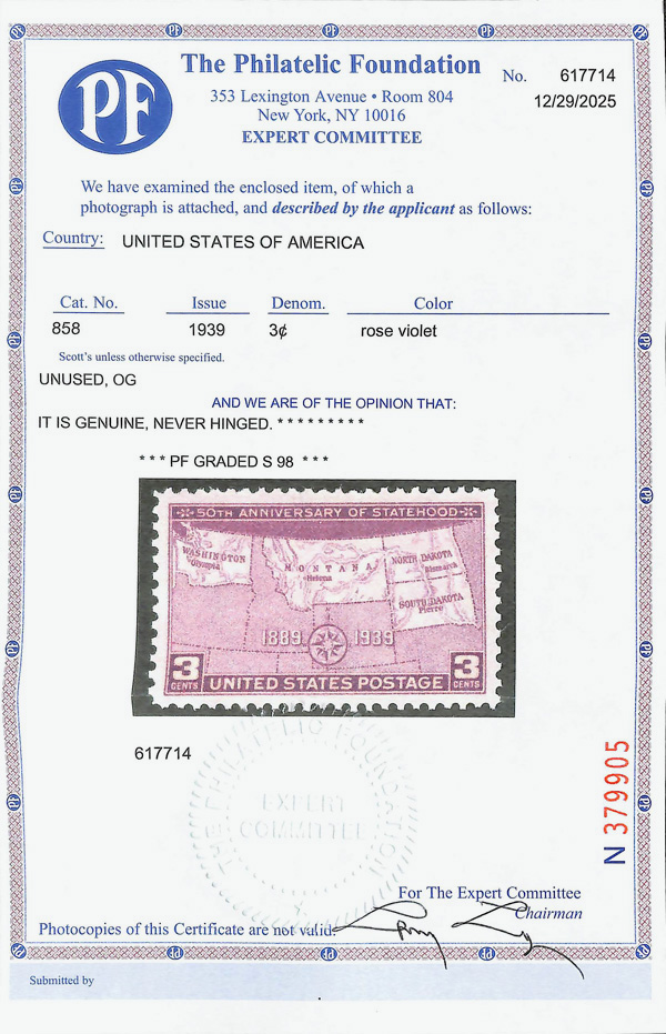 7242 nh 858 image1939, 3¢ Statehood Anniversaries (Scott 858), o.g., never hinged, Superb, with 2025 P.F. certificate graded SUP 98.