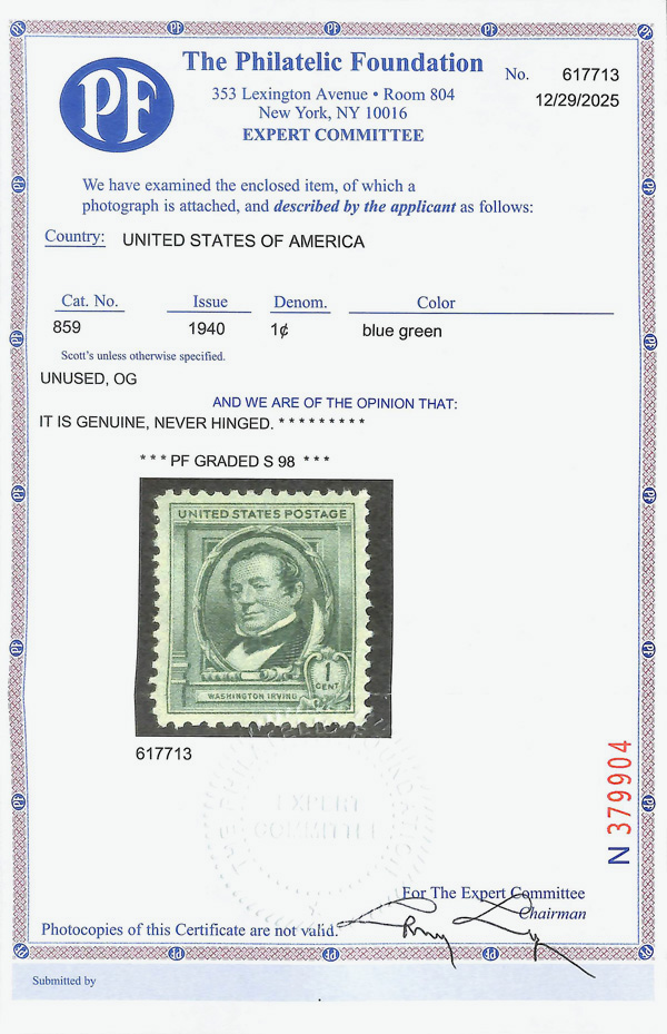 7243 nh 859 image1940, Famous Americans, 1¢ Washington Irving (Scott 859), o.g., never hinged, Superb, with 2025 P.F. certificate graded SUP 98.