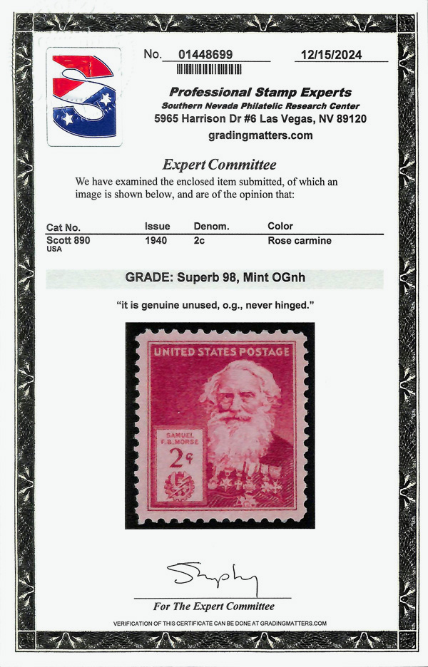 7249 nh 890 image1940, Famous Americans, 2¢ Morse (Scott 890), Bright, stable color, o.g., never hinged, Superb, with 2024 P.S.E. certificate graded SUP 98.