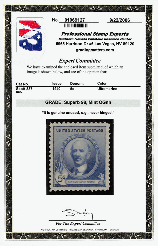 7247 nh 887 image1940, Famous Americans, 5¢ Daniel French (Scott 887), o.g., never hinged, Superb, with 2006 P.S.E. certificate graded SUP 98.