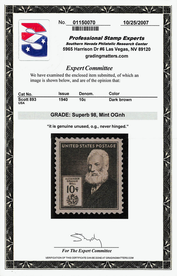 7252 nh 893 image1940, Famous Americans, 10¢ Alexander Graham Bell (Scott 893), o.g., never hinged, Superb, with 2007 P.S.E. certificate graded SUP 98.
