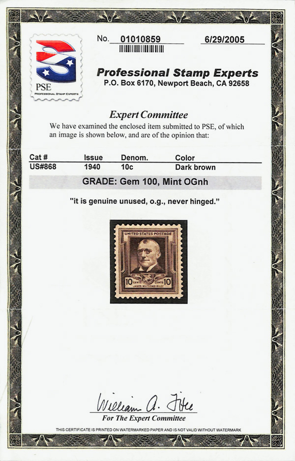 7244 nh 868 image1940, Famous Americans, 10¢ Riley (Scott 868), o.g., never hinged, Superb, with 2005 P.S.E. certificate graded GEM 100.
