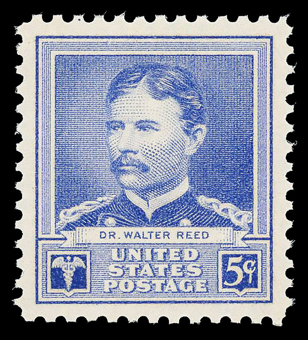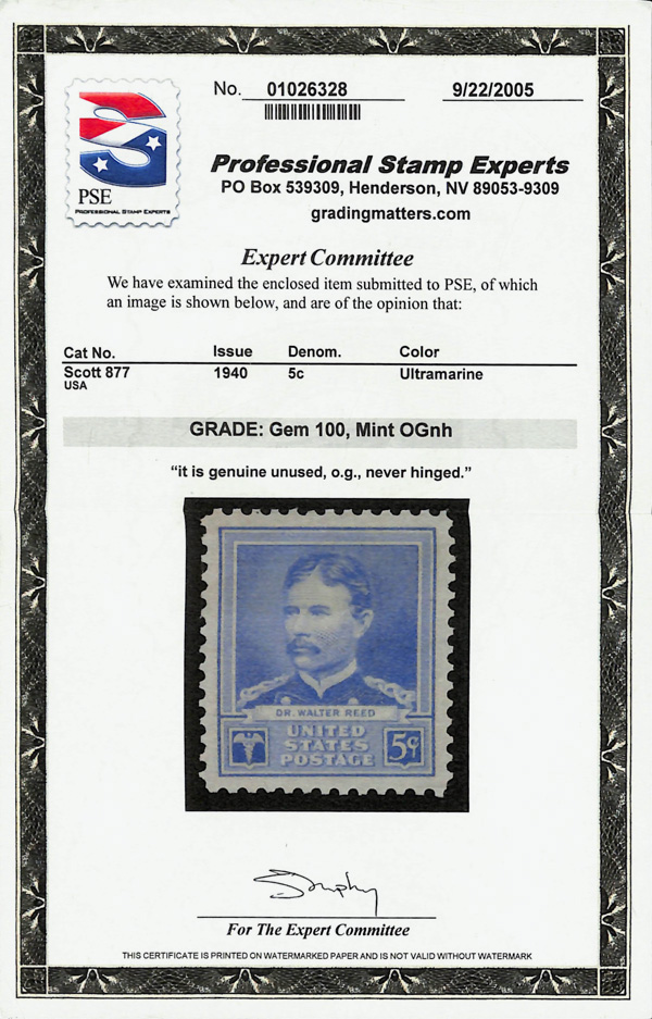 7246 nh 877 image1940, Famous Americans, 5¢ Dr. Walter Reed (Scott 877), o.g., never hinged, Superb, with 2005 P.S.E. certificate graded GEM 100.