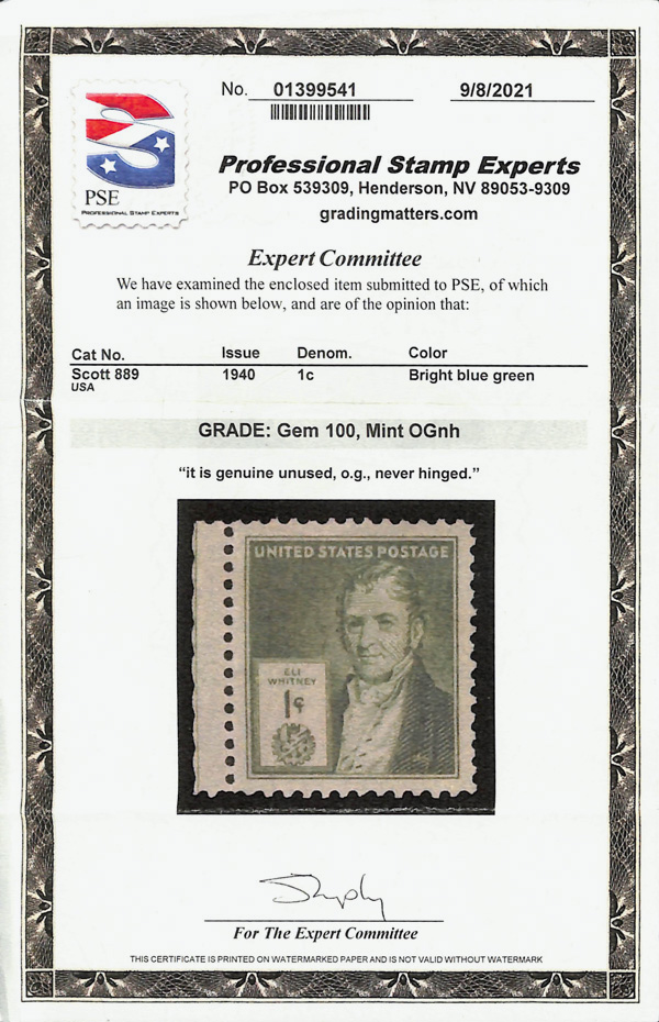 7248 nh 889 image1940, Famous Americans, 1¢ Eli Whitney (Scott 889), o.g., never hinged, Superb, with 2021 P.S.E. certificate graded GEM 100.
