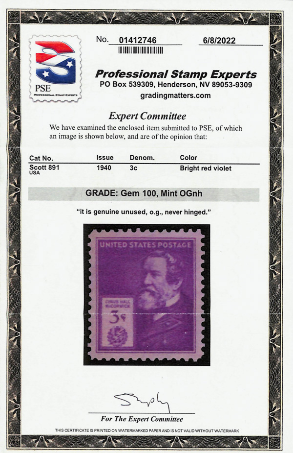 7250 nh 891 image1940, Famous Americans, 3¢ McCormick (Scott 891), o.g., never hinged, Superb, with 2022 P.S.E. certificate graded GEM 100.