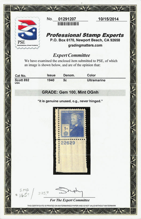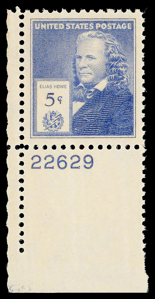 7251 nh 892 image1940, Famous Americans, 5¢ Elias Howe (Scott 892), plate number single, o.g., never hinged, Superb, with 2014 P.S.E. certificate graded GEM 100.