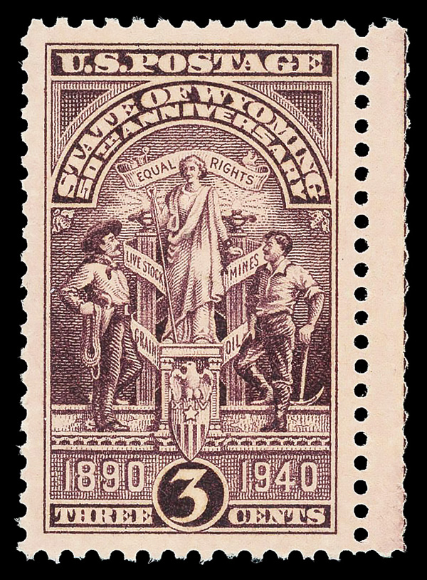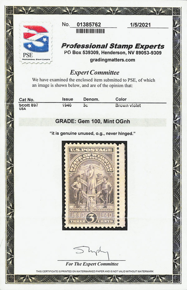 7255 nh 897 image1940, 3¢ Wyoming Statehood (Scott 897), o.g., never hinged, Superb, with 2021 P.S.E. certificate graded GEM 100.