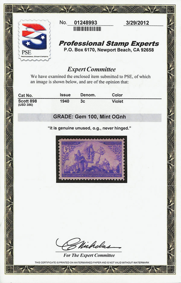 7256 nh 898 image1940, 3¢ Coronado Expedition (Scott 898), o.g., never hinged, Superb, with 2012 P.S.E. certificate graded GEM 100.