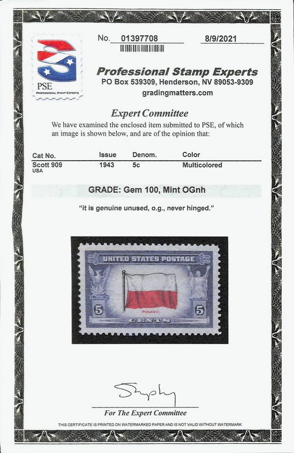 7267 nh 909 image1943, 5¢ Overrun Countries: Poland (Scott 909), o.g., never hinged, Superb, with 2006 P.S.E. certificate graded GEM 100.