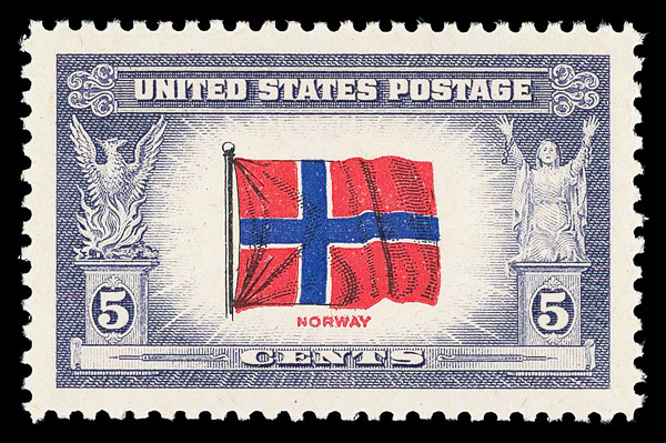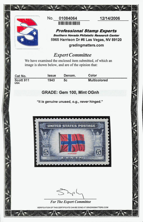 7268 nh 911 image1943, 5¢ Overrun Countries: Norway (Scott 911), o.g., never hinged, Superb, with 2006 P.S.E. certificate graded GEM 100.