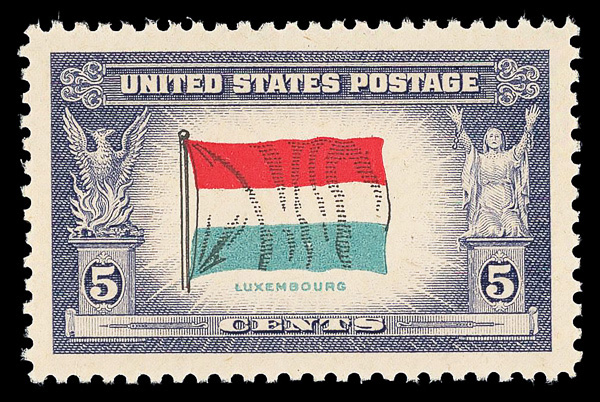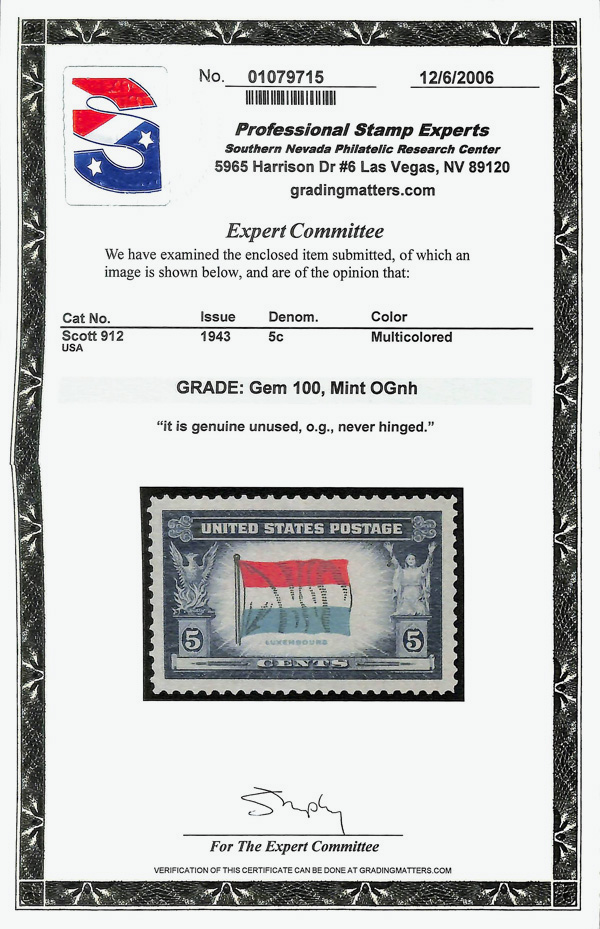 7269 nh 912 image1943, 5¢ Overrun Countries: Luxembourg (Scott 912), o.g., never hinged, Superb, with 2006 P.S.E. certificate graded GEM 100.