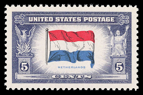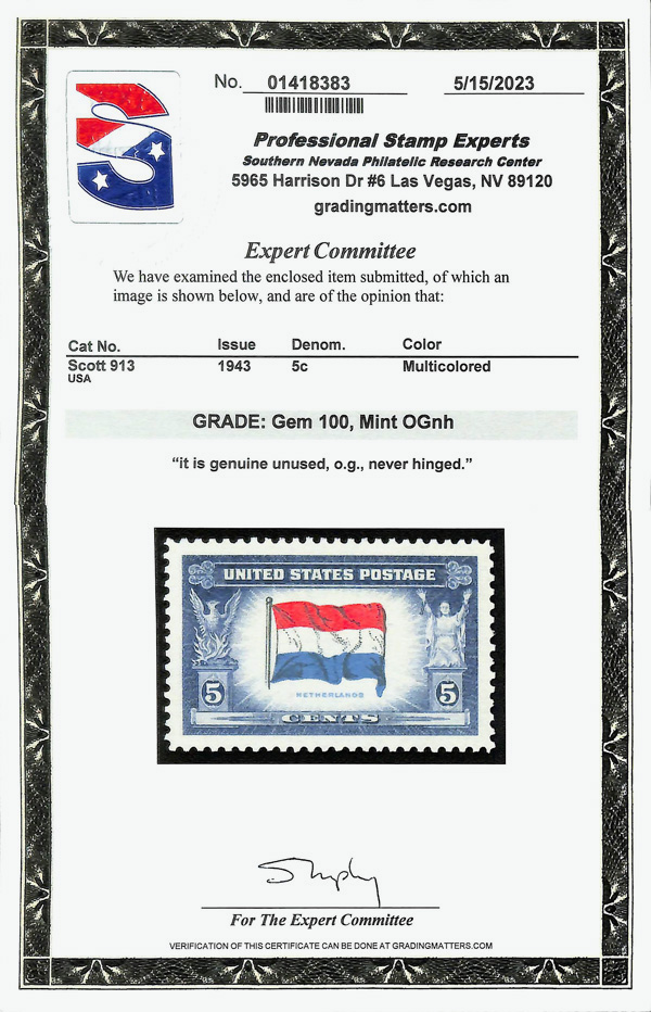 7270 nh 913 image1943, 5¢ Overrun Countries: Netherlands (Scott 913), o.g., never hinged, Superb, with 2023 P.S.E. certificate graded GEM 100.