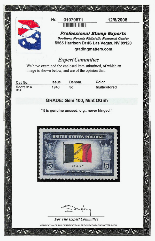 7271 nh 914 image1943, 5¢ Overrun Countries: Belgium (Scott 914), o.g., never hinged, Superb, with 2006 P.S.E. certificate graded GEM 100.