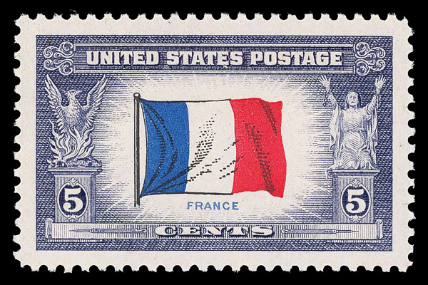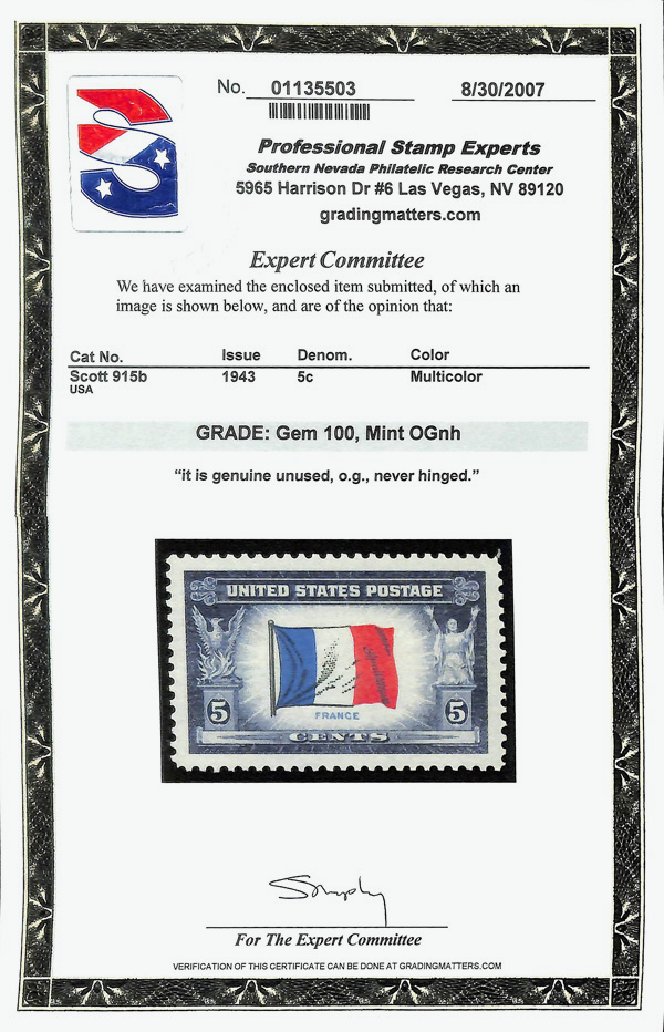 7272 nh 915 image1943, 5¢ Overrun Countries: France (Scott 915), o.g., never hinged, Superb, with 2007 P.S.E. certificate graded GEM 100.