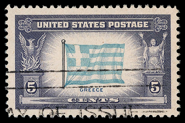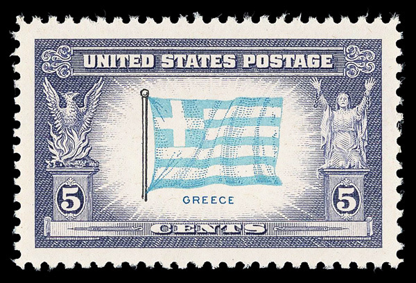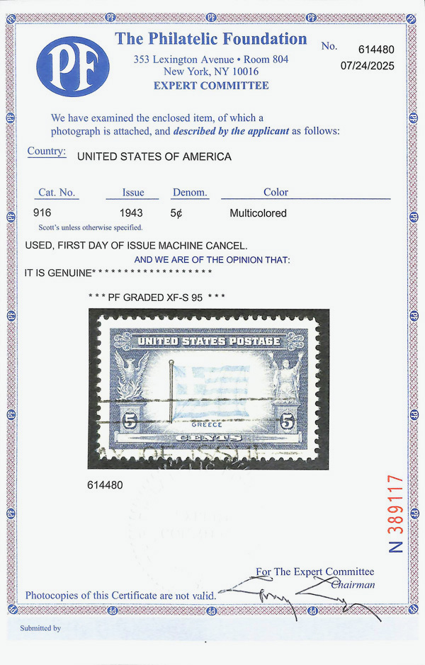 7274 O 916 image1943, 5¢ Overrun Countries: Greece (Scott 916), Extremely Fine to Superb, with 2025 P.F. certificate graded XF-SUP 95.