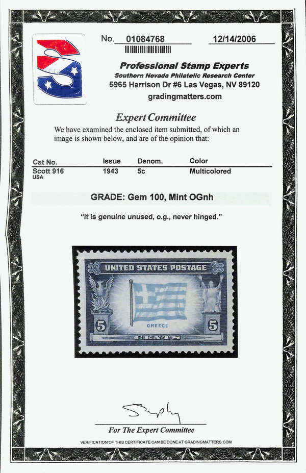 7273 nh 916 image1943, 5¢ Overrun Countries: Greece (Scott 916), o.g., never hinged, Superb, with 2006 P.S.E. certificate graded GEM 100.
