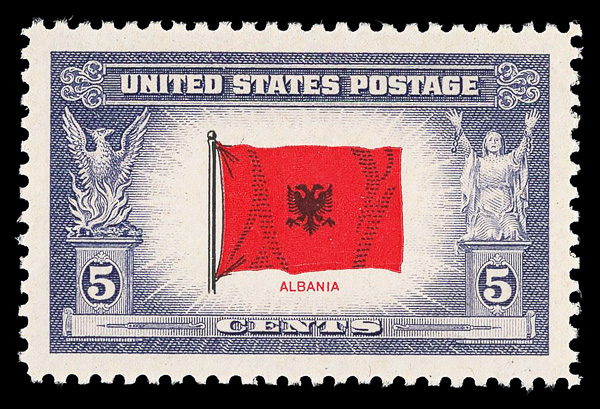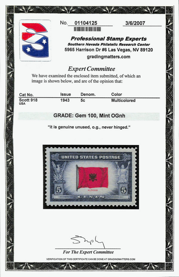 7275 nh 918 image1943, 5¢ Overrun Countries: Albania (Scott 918), o.g., never hinged, Superb, with 2007 P.S.E. certificate graded GEM 100.