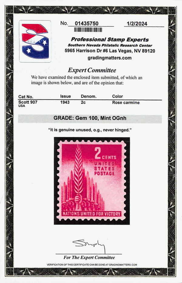 7266 nh 907 image1943, 2¢ Allied Nations (Scott 907), o.g., never hinged, Superb, with 2024 P.S.E. certificate graded GEM 100.