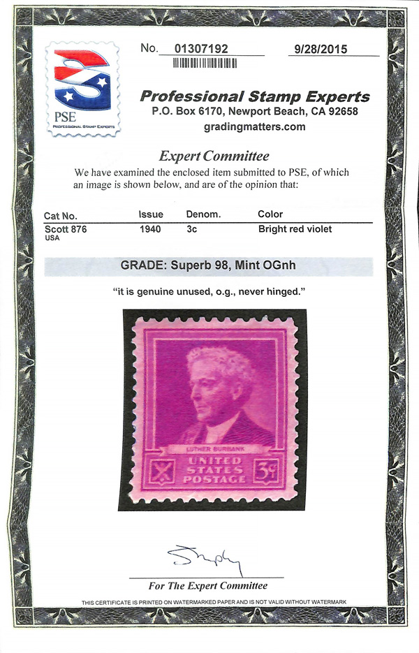 7245 nh 876 image1940, Famous Americans, 3¢ Luther Burbank (Scott 876), o.g., never hinged, Superb, with 2015 P.S.E. certificate graded SUP 98.