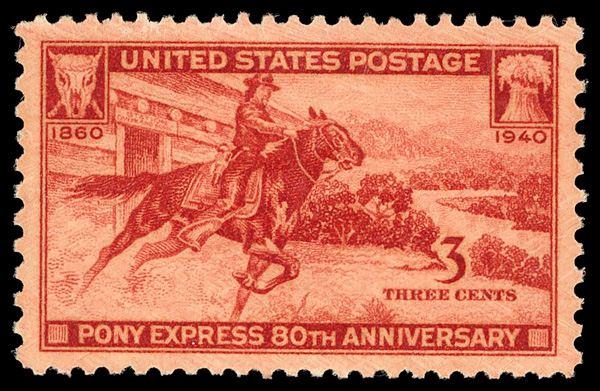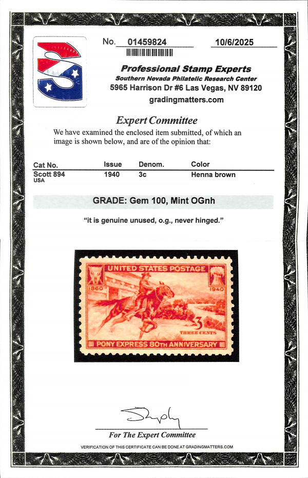 7253 nh 894 image1940, 3¢ Pony Express (Scott 894), o.g., never hinged, Superb, with 2025 P.S.E. certificate graded GEM 100.