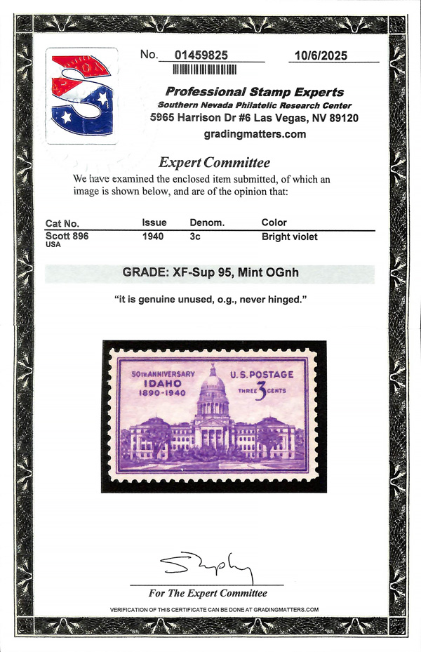 7254 nh 896 image1940, 3¢ Idaho Statehood (Scott 896), o.g., never hinged, Extremely Fine to Superb, with 2025 P.S.E. certificate graded XF-SUP 95.