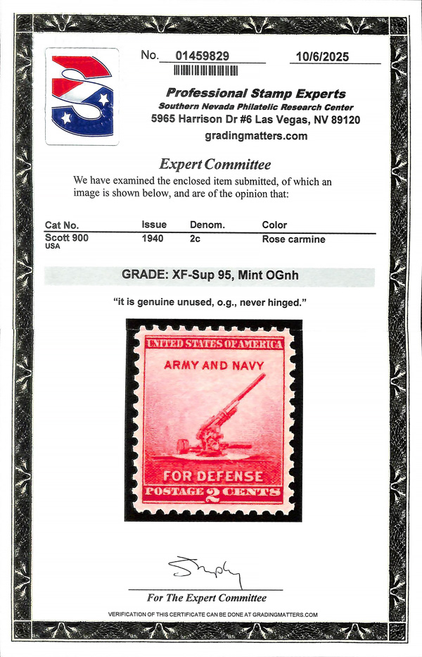 7259 nh 900 image1940, 2¢ Defense (Scott 900), o.g., never hinged, Extremely Fine to Superb, with 2025 P.S.E. certificate graded XF-SUP 95.