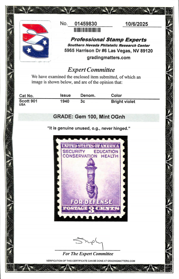 7260 nh 901 image1940, 3¢ Defense (Scott 901), o.g., never hinged, Superb, with 2025 P.S.E. certificate graded GEM 100.