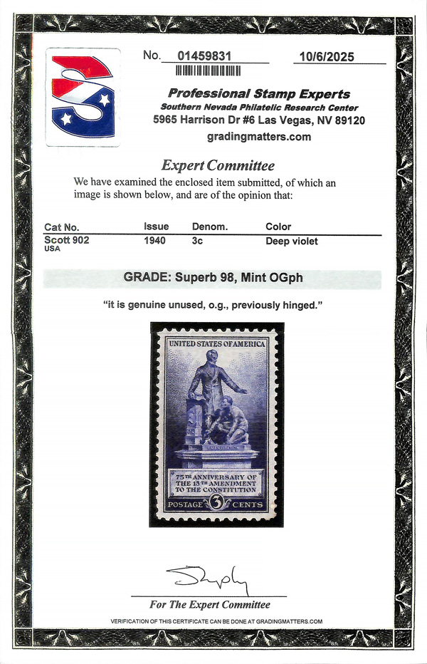 7261 og 902 image1940, 3¢ Thirteenth Amendment (Scott 902), o.g., barest trace of hinge (appears never hinged), Superb, with 2025 P.S.E. certificate graded SUP 98. (Image) (Image2) (All Images)