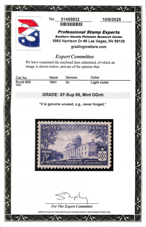 7262 nh 903 image1941, 3¢ Vermont Statehood (Scott 903), o.g., never hinged, Extremely Fine to Superb, with 2025 P.S.E. certificate graded XF-SUP 95.