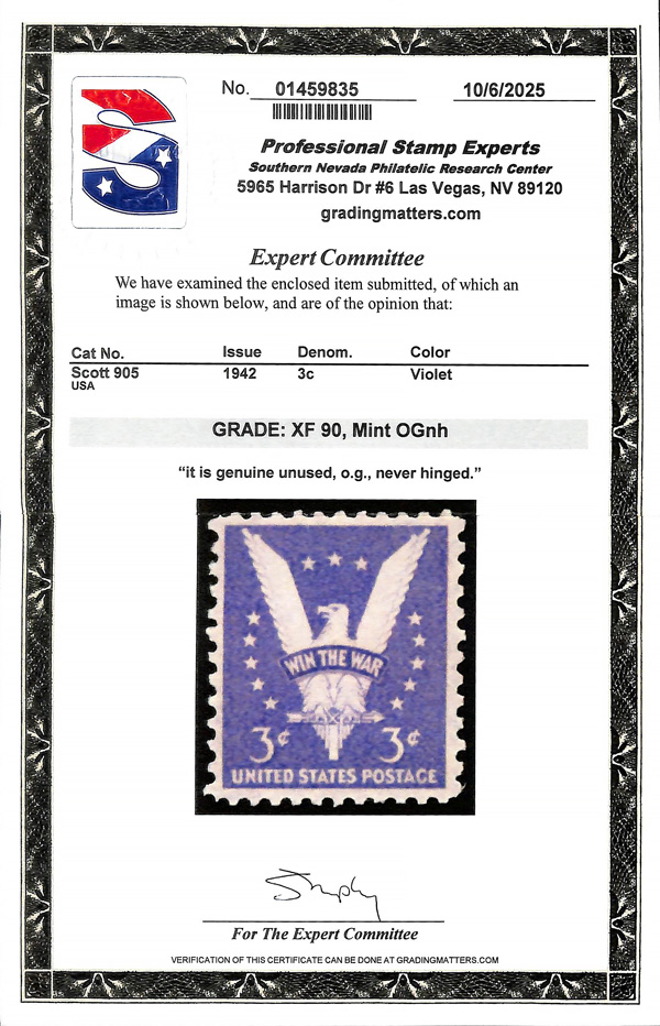 7264 nh 905 image1942, 3¢ Win the War (Scott 905), o.g., never hinged, Extremely Fine, with 2025 P.S.E. certificate graded XF 90.