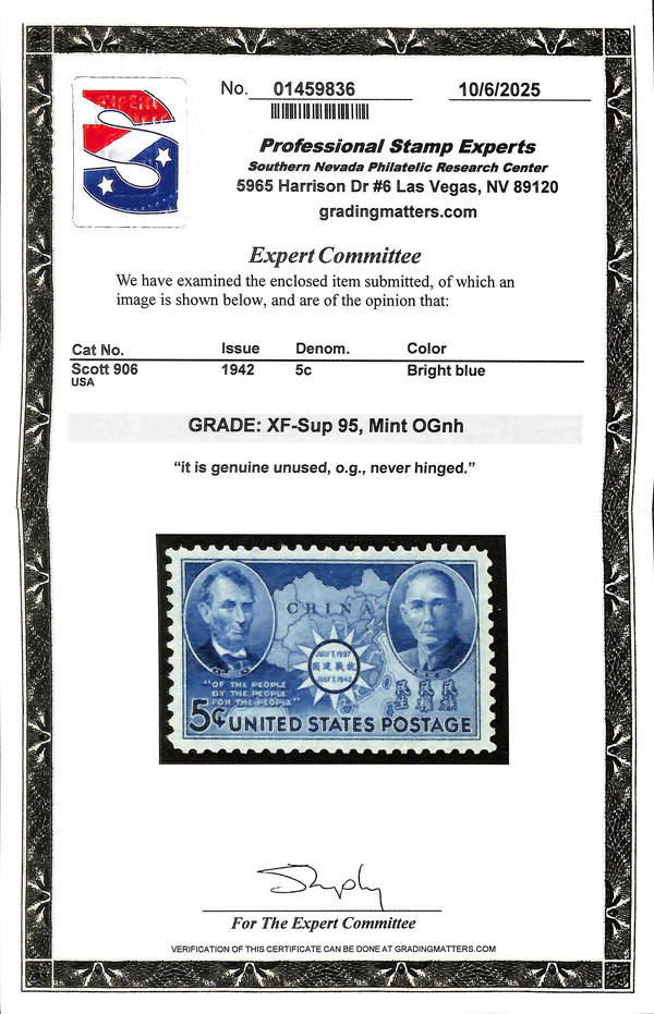 7265 nh 906 image1942, 5¢ Chinese Resistance (Scott 906), o.g., never hinged, Extremely Fine to Superb, with 2025 P.S.E. certificate graded XF-SUP 95.
