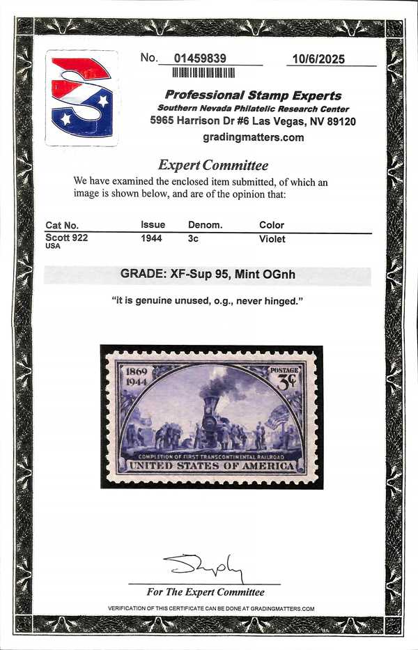 7276 nh 922 image1944, 3¢ Transcontinental Railroad (Scott 922), o.g., never hinged, Extremely Fine to Superb, with 2025 P.S.E. certificate graded XF-SUP 95.