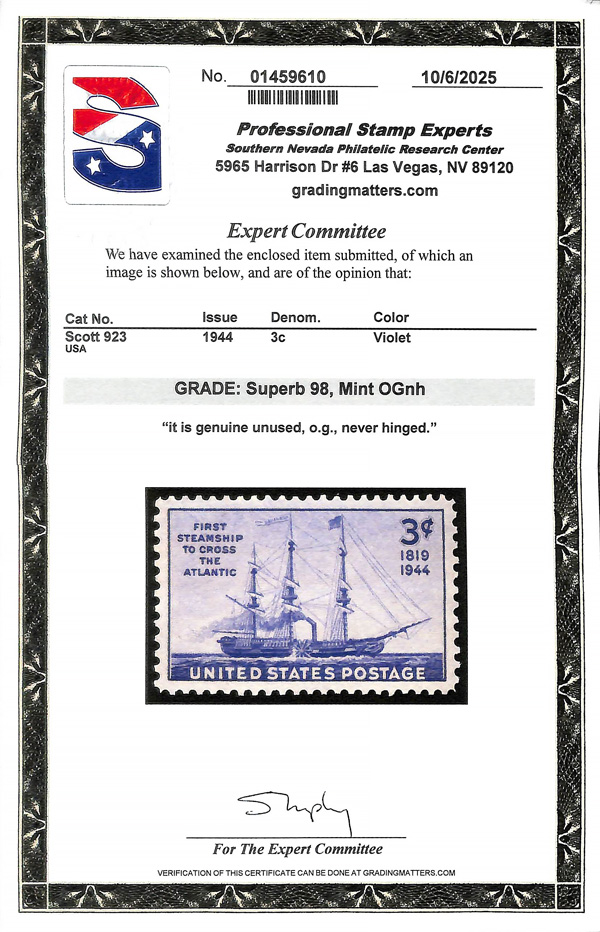 7277 nh 923 image1944, 3¢ Steamship (Scott 923), o.g., never hinged, Superb, with 2025 P.S.E. certificate graded SUP 98.