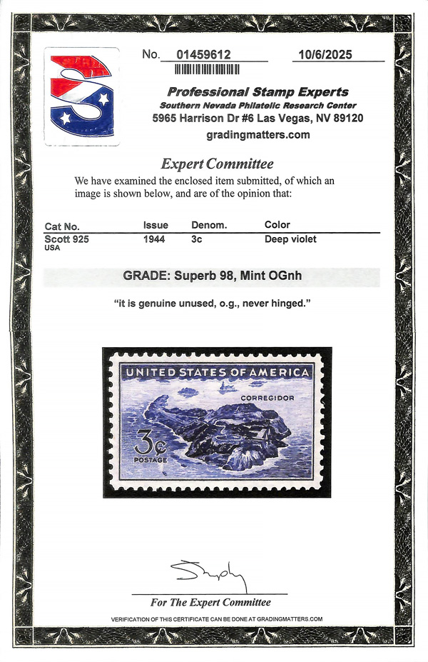 7278 nh 925 image1944, 3¢ Corregidor (Scott 925), o.g., never hinged, Superb, with 2025 P.S.E. certificate graded SUP 98.
